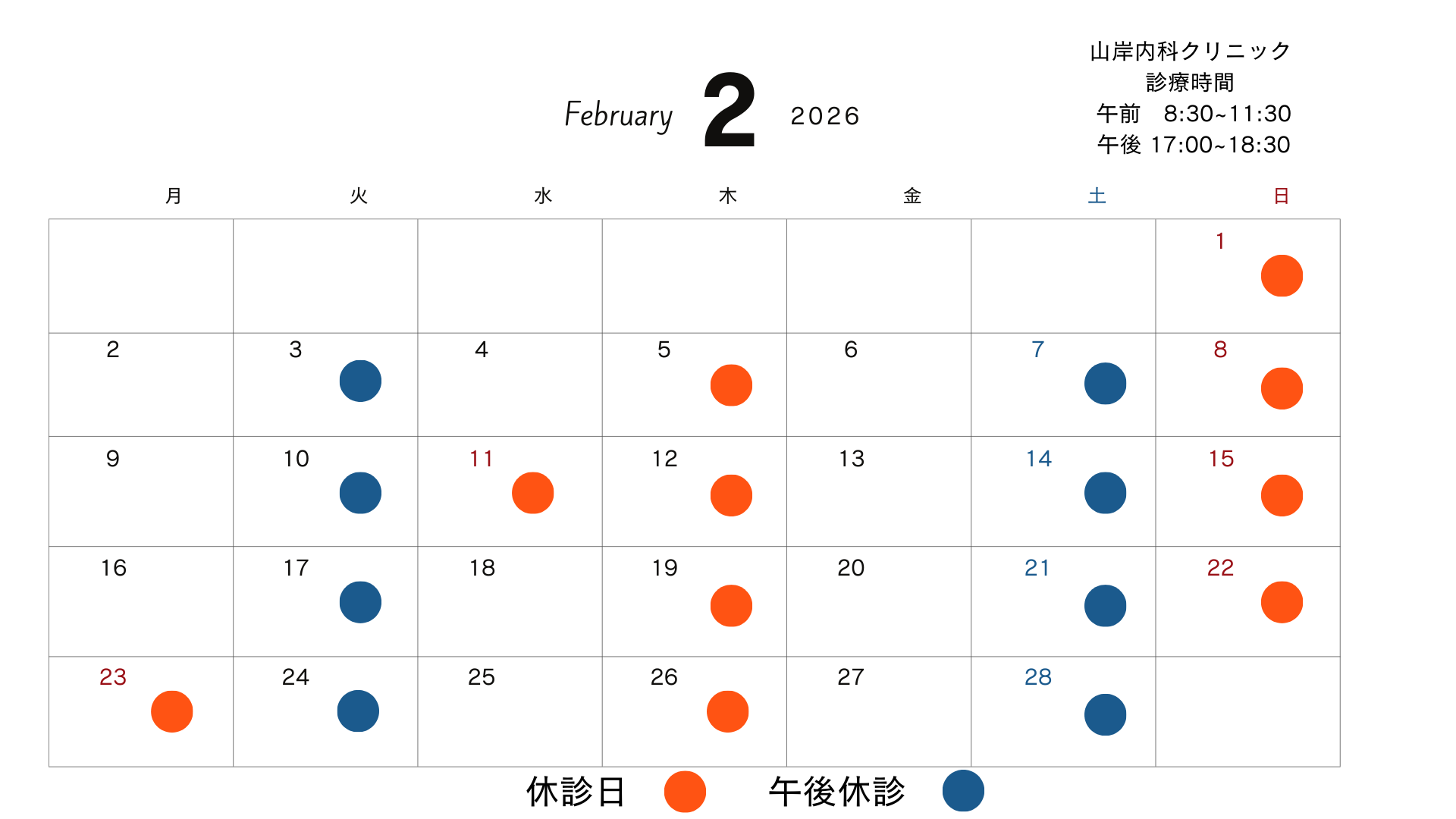 診療カレンダーのご案内です。あま市、稲沢市、津島市、愛西市近くの山岸内科クリニック。